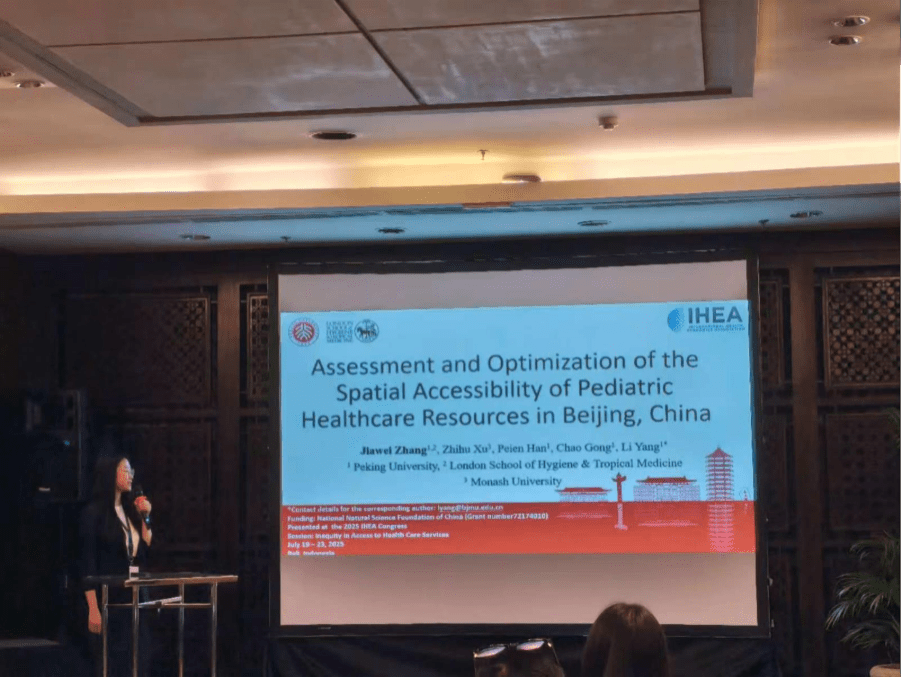 Jiawei Zhang, a joint PhD student at Peking University and the London School of Hygiene & Tropical Medicine, presented research in a session on inequity in healthcare access. Her paper, Assessment and Optimization of the Spatial Accessibility of Pediatric Healthcare Resources in Beijing, China, analyzed the current distribution of pediatric medical resources in Beijing. The study examined the accessibility of pediatric doctors and hospital beds, and proposed resource optimization strategies to support equitable access to pediatric healthcare.